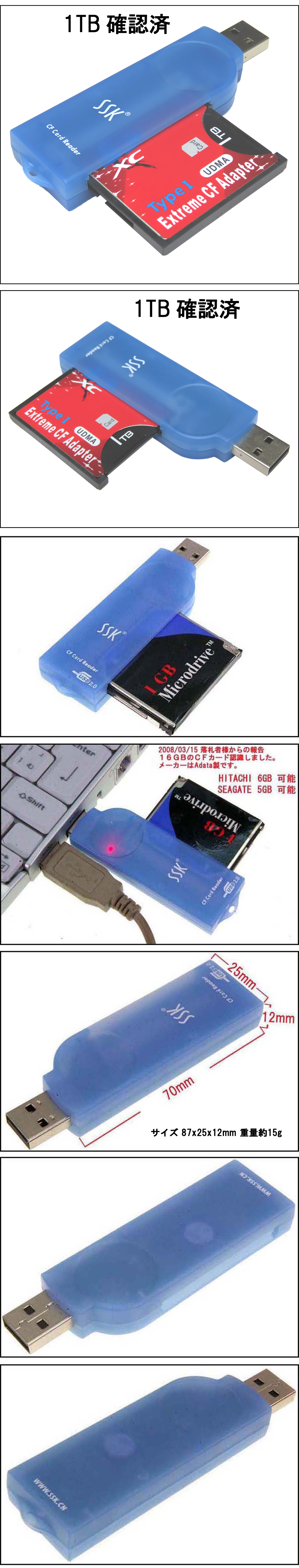 ■中国製 USB2.0対応 コンパクトフラッシュCFカードリーダーライター 片寄りタイプ 新品 ■コンパクトタイプ ■マイクロドライブ対応 当方1GBしかないので何ギガまで可能かは不明です。 ■1GB以外のドライブをテストできましたらそのつど掲載致します。 ■こんな便利なカードリーダーライターがあったんです。 ■USBが横2列に並んでいる場合マウスとこの片寄りカードリーダーを挿せます。 ■パッケージをはさみで切って点検する為、気になる方は購入をご遠慮下さい。 ■輸入品の為、大変申し訳ありませんが保障期間は1週間とさせて頂きます。 ■この商品 メール便 送料 160円で発送可能です。(メール便 代引き不可) 2個ほど同包できます。パッケージなしなら10個ほど同包できます。 ただしパケージが痛む可能性がありますので、気になる方はご遠慮ください。 ■この商品エクスパック(全国500円)で発送可能です。(エクスパック代引き不可) ■メーカー希望販売価格 4,200円(\4,410円税込) ■No1888 |