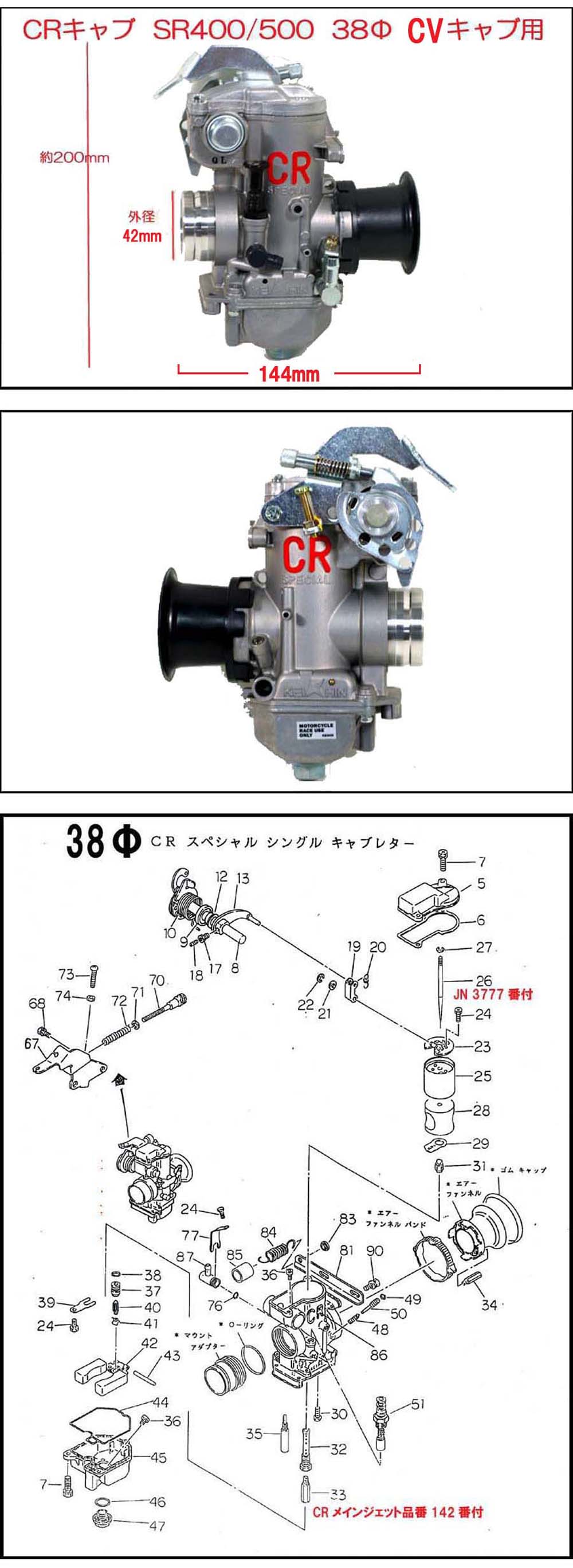 ■京浜 CR38Φ 88-00'SR400/500 CVタイプ用 レーシングキャブレター 新品 ■78-87'VMタイプとは、ノーマルキャブのスロットルがピストンタイプです。アダプタ44Φ ■88-00'CVタイプとは、ノーマルキャブのスロットルが風圧式タイプです。アダプタ42Φ ■フレームに少し干渉しますので、少し傾けて取付けて下さい。 ■パーツリスト付。 ■SRに合うと言うだけで、専用では有りません。 ■他の4サイクル単気筒にも使用可能です。 ■この商品の分かる方のみお買い求め下さい。 ■サポートの難しい商品です。 ■メーカー希望販売価格\29,400円税込 バムレーシング ■No0926 |