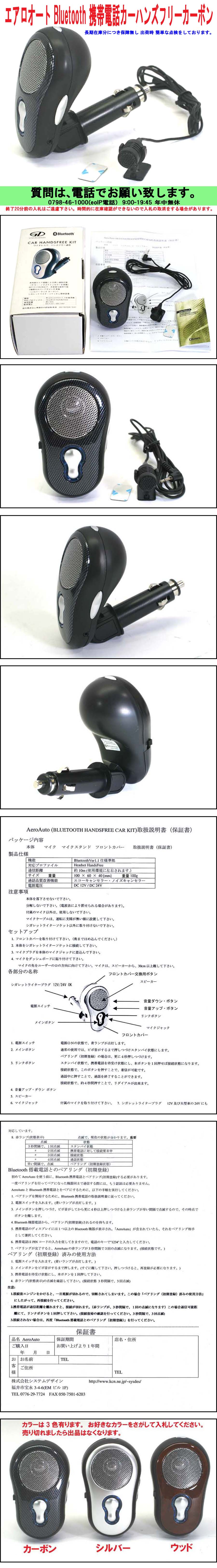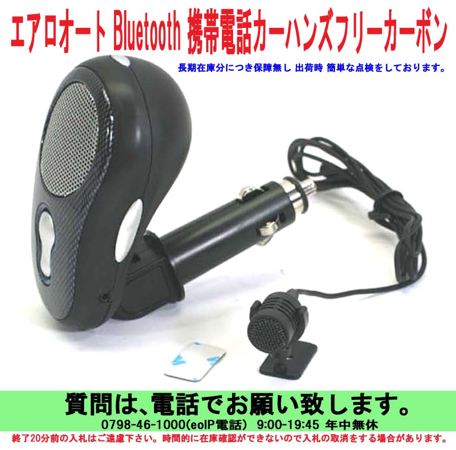■エアロオート Bluetooth ブルートゥース カーハンズフリーKIT カーボン 新品 ■こんな便利なものがあったのです。 ■ブルートゥース機能の付いた携帯電話をお持ちの方はとても便利です。 ■車の乗り降りにスピーカにつなぐ必要はもうありません。 ■一度設定すると、次回からは小さいボタンを2秒間長押しして大きなボタンを1回押すだけ。 ■複数台お車をお持ちの方でも、本体の取付け、取り外し簡単。設定は必要ありません。 ■大型スピーカにマイクを好きな位置に設定してください。 ■電話が鳴れば大きなボタンを押します。通話が終わればまた大きなボタンを押して終了。 ■12V、24Vに対応(切替の必要なし)大型トラックでも使用可能です。 ■高性能DSP (米国FORTE MEDIA製)による、エコーキャンセラ ノイズキャンセラを徹底 調整指向性マイク採用で、あたかも、助手席の方と会話しているような使用感です。 ■説明書付き、1年間保証書付き。 ■この商品のお問合せは 潟Vステムデザイン 0742-51-0877 迄お願い致します。 ■メーカー希望販売価格 12,600円税込 ■特価販売価格\5,000 ■No1781 エアロオートホームページ |