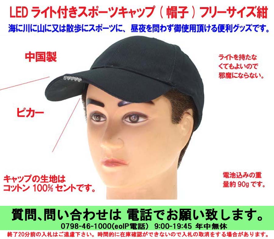 ■懐中電灯 5LEDライト付き スポーツキャップ(帽子) フリーサイズ 紺 新品 ■前方ホワイト発光ダイオード搭載のライト付スポーツキャップです。 ■前方のつば部分にホワイトLED5個が付いているので夜間での作業が楽に出来ます。 ■つばの裏側右部分にわずかにふくらんだ場所にスイッチが隠れています。 ■使用電池はリチウムバッテリー CR2032(3V) 2個テスト用に付属しています。 ■どなた様にも飽きの来ない無地のスポーツキャップです。 ■マジックテープ タイプ のフリーサイズ になります。 ■防水型ではありませんので水に濡らしたり、雨の日は使用しないで下さい。 ■保障は有りません。届いた時点で問題有れば交換致します。 ■コットン100% ■色は他に 赤色、薄茶色、茶色、ピンク色、紺色、など出品してます。 ◎◎◎ 用途 ◎◎◎ ■停電時、災害時に両手が使えますので、とても重宝致します。 ■夜の散歩、夜道のウォーキング。 ■車の故障時、整備作業、暗がりの作業などに効果発揮します。 ■メーカー希望販売価格 \5,000円+税 ■CAP090514-DB1 |
