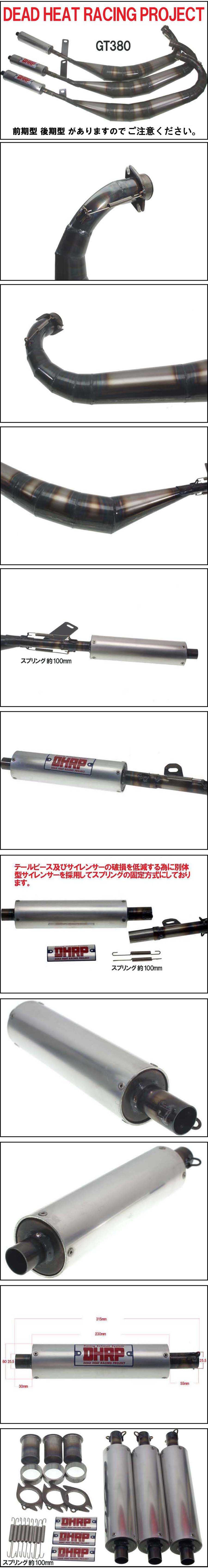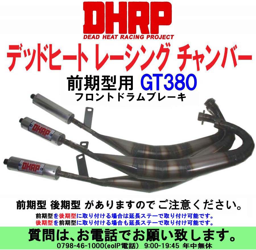 ■デッドヒート GT380 レーシングチャンバー アルミサイレンサータイプ 新品 ■DHRP アルミプレート 3枚付(両面テープ付) ★スチールクリアー塗装仕上げ ★近接排気騒音 95db ★60Φ アルミサイレンサー ★総重量 6.4Kg 全ての付属品含む ★センタースタンド不可 サイドスタンド可。 ■レーシングチャンバーで外観が見違えります。 ■セッティングによりパワーがアップいたします。 ■重量が軽くなるためバネ下重量パワーが増します。 ■バネ下重量が軽いため取り回しがとても楽になります。 ■爽快なサイレンサーの音により走行が楽しくなります。 前期型 後期型 がありますので ご指定ください。 ■メーカー希望販売価格 \105,000円(\115,500円税込) ■100906 |