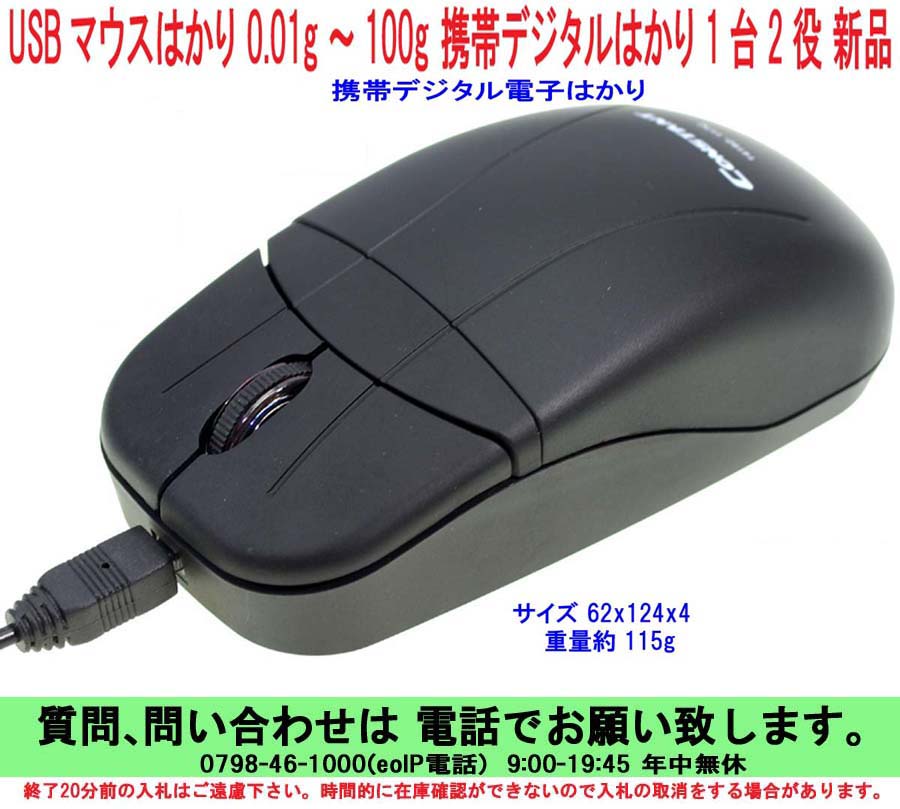 ■USBマウスはかり 0.01g〜100g 携帯デジタルはかり 1台2役 新品 ●100gの分銅(おもり)1個付 ■はかりの誤差を確認するため100gの分銅を使用して誤差のご確認をお願い致します。 ■いつも身近にあると、とても便利な マウスはかり 1台2役 ■精密 高精度 低価格 小型軽量 デジタルスケール 電子はかり 0.01〜100g 秤 ■高精度ですが 若干の プラス マイナス の誤差が出るそうです。 ■0.01グラムから100gまではかれますので、用途が拡大します。 ■マウスですから場所を取りません。持ち運びも楽です。 ■USBに挿すだけで光学式マウスとして使用でき同時に充電もします。 ■オプティカル専用のマウスパットは必要ありません、一般的なパットでOK ■クッキリ表示、バックライト付き大型液晶 ■ステンレス製トッププレートを採用、清潔、綺麗、が売りです。 ■4つの測定モード、g(グラム)、 oz(オンス)、dwt(ペニーウェイト)、ozt(トロイオンス) モードはワンタッチで選択、切り替え可能です。 ■オートパワーオフ機能 約60秒無操作で電源が切れ、電源の節約が可能です。 ■充電式でどこでも計量可能。屋外でも使用可能です。防水機能はありません。 ■充電式のため電池は不要です。電池交換できません。 ■サイズ 62x124x41 重量約 115g ■英文説明書付、日本語の説明書も付いています。 ■保障期間は1週間以内です。 ■1週間以内に故障しましたら良品と交換させていただきますので 当社に送って下さい、大変申し訳有りませんが送料はご負担下さい。 ■送料500円とあるのはレターパック500の発送です。運送便の発送ではありません。 ■特に沖縄.北海道の遠の方、商品やパッケージが傷む率が高いので避けて下さい。 ■レターパック500は代引き時間指定不可、未着破損の保障がありません。 ■レターパック500は商品が痛む可能性が有りますので、気になる方はご遠慮ください。 ■レターパック500はパッケージが痛みますので、気になる方はご遠慮ください。 ■レターパック500で発送の場合、他の商品と同梱発送が出来ない場合があります。 ●代引き とは代金引換のことです。着払いとは意味が違います。 ■レターパック500の入る規格、340mm×248 厚さ制限なし.重さ4kgまで。 ■メーカー希望販売価格 ¥9,000円(¥9,450円税込み) ■111015-R75BK |