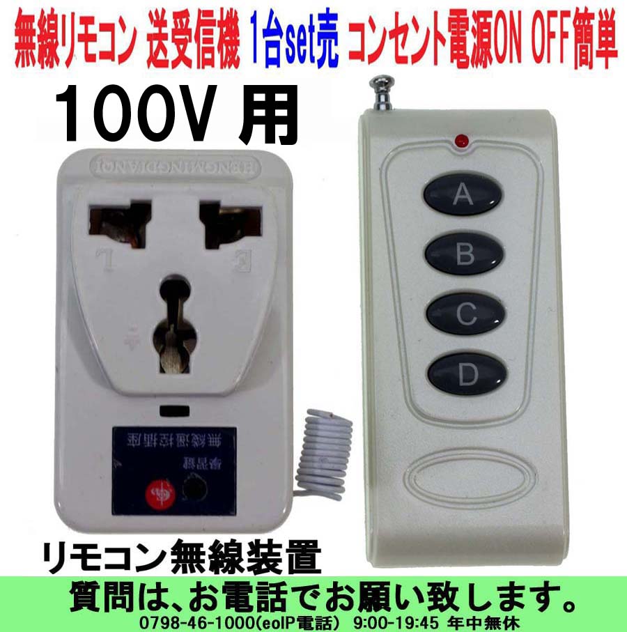 ■無線リモコン 送受信機 コンセント電源ON OFF簡単 リモコン無線装置 1台set売 ■コンセント付受信機は100V1000Wまで使用できます。 ■送信機、受信機 各1台set売です。 ■コンセントに挿すだけで 電源のON OFFが簡単に出来ます。 ■コンセント電源タップは3個口ありますので別途継足し不要 ■1台のリモコン送信機で別々の4台のコンセント受信機を操作できます。 ■送信機 電池12V8mA(23A) 4チャンネルで何台でもコンセント付受信機に登録出来ます。 ■受信機100V10A 315MHz サイズ67x41x26 送信機の周波数変更で何台でもOK ■微弱電波により約100Mの範囲であらゆる電源のスイッチを操作できます。 ■無線だからリモコンはどこに向けても受信機は作動します。 ■下記カタログの全てのリモコン送信機と組み合わせることが可能です。 ■リモコンの組み合わせについては電話にてお尋ねください。 ◎あらゆる電機製品の電源は次の製品などを操作できます。 ■扇風機 ■電気スタンド ■夜間灯 ■スポットライト ■ショーケースの照明 ■オイルヒーター ■1000Wまでの電気ストーブ ■1000Wまでの電気ポット ■1000Wまでの自動販売機 ■各コーナーのゲーム機 ■ラジオやステレオやテレビ ■FAXやコピー機 ■携帯電話及びゲーム機の充電器 ■バイクや自動車の充電器 ■モーターやポンプ ■身近にあるいろんな製品の電源スイッチがリモコン操作できます。 ■簡単な日本語説明書付 ■保障期間は1週間でお願い致します。 ■中国製の為完璧な物は有りませんので気になる方のご購入はご遠慮下さい。 ■キズ ヘコミ などありますので気になる方のご購入はご遠慮下さい。 ■使用出来たら良いと思う方にご購入をお願いいたします。 ■完全点検の上出荷いたしますのでご安心下さい。 ■特殊な商品ですので分かる方のみご購入をお願い致します。 ■1台売から.2台.3台.4台.5台.6台.7台.8台.9台.10台.11台.12台売があります。 ■まとめ買いは安くなるように設定いたしました。 ■No131111-R30W4 |