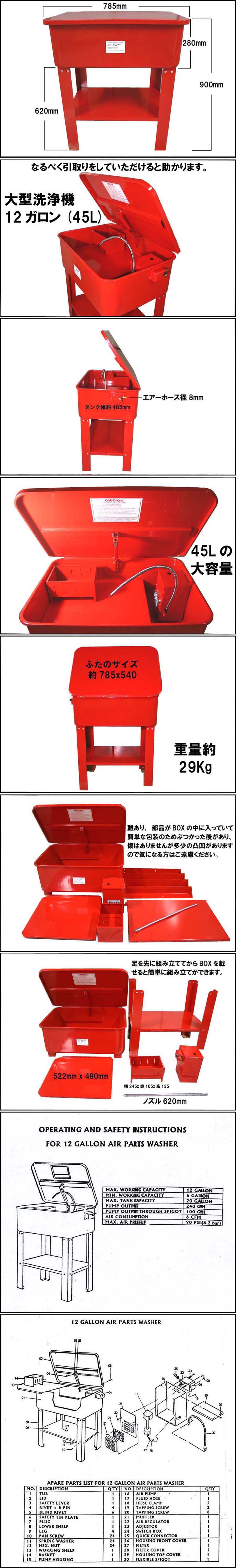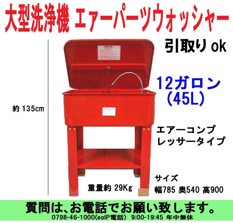 ■エァーパーツウォッシャー 大型洗浄機 12ガロン(45L) 新品 ■電動式で無いのでエアーコンプレッサーの無い方は使用出来ません。 ■電気ポンプを使用していない為故障することはほとんど有りません。 ■大きなパーツの洗浄が可能です。 ■自動車修理工場及びバイク修理販売店又はマニアの方にお勧めです。 ■難あり、中のパーツが簡単な梱包な為、ぶつかった跡があり、傷は有りませんが、 多少の凸凹が有りますので気になる方はご遠慮下さい。 ■タンク最大容量20ガロン(75リットル) ■本体サイズ 幅約785mmcm 奥行き約540mm 全高約275mm ■中敷サイズ 522mm x 490mm ■小物入れサイズ 245mm x 100mm ■重量約 29Kg ■日本語の説明書は有りませんが、操作も組み立ても簡単に出来ます。 ■保障は初期不良のみ対応いたしますので届いた時点で確認をお願い致します。 ■信頼の台湾製 メーカー希望価格31,290税込 ■No1530 |