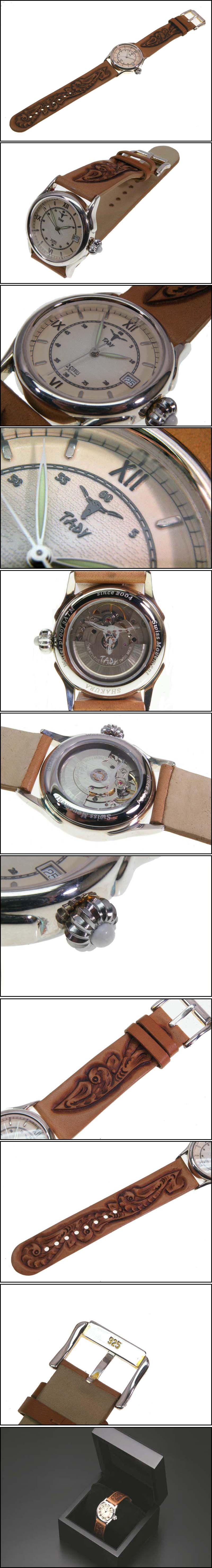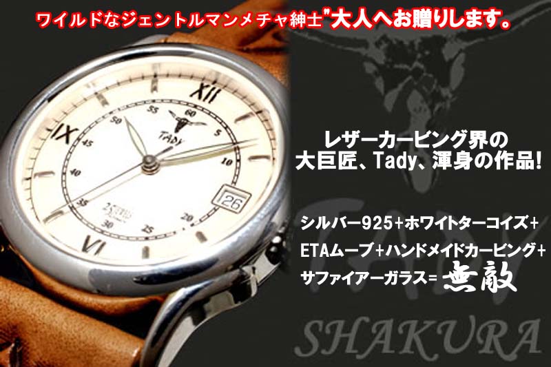 [uas]自動巻腕時計 田尻種彬TADY アンティークウォッチ SHAKURA ■新品 レザーカービングの巨匠 田尻種彬【TADY】がデザイン! した自動巻アンティークウォッチTADY SHAKURA(シャクラ) 裏蓋はスケルトンで自動巻が体感できる防水式腕時計 バンドは手彫りの彫刻の為、指紋と同じく2つと同じ物は出来ない こだわりの逸品をぜひあなたの腕に ゴローズ高橋吾郎氏の一番弟子にして日本のレザーカービングの第一 人者である巨匠田尻種彬(たじりたねあきら)氏が手掛けるブランド。 徹底した妥協許さない作品に対する姿勢は多くのクリエイターから リスペクトされています。キャリアは勿論、実力でも他を寄せ付け ない真の匠です。 ”ヨウジ ヤマモト”、”ケイタ マルヤマ”などとのコラボも多数。 レザーのキャンパスに、100種類以上の工具で彫刻のように立体的な 文様を刻み込んでいく。 みるみるうちに描かれる様子は、まさに”ゴッドハンド”です。 ●(匠)素材(革について) 超一流は技術だけでなく、素材を厳選する眼も超一流です。 素材は牛革タンロー(タンニンなめしロウケツ染・北米産の成牛のサイド皮)を 使用し、彫刻前に硬水を薄く染みこませて天日で乾燥させます。 この作業を3回繰り返します。 この地味で見えない作業が仕上がり時の何ともいえない風合を生み出します。 ●(匠)文字盤 アンティーク処理(技法は企業秘密です。すいません)を施した文字盤は中央を マットなディンプル加工に仕上げました。 外周、内周ともに施されたレイルウェイインデックスがシンプルなバーインデックス と調和しています。控えめながら存在感のあるローマンインデックスが6、9、12時 位置に配置されてさわやかな印象です。 ●(匠)クラウン(リューズ/竜頭) アメリカ産のハウライト(ホワイトターコイズ)をTOPに使用。ネイティブインディアン たちの間では 崇高、誇りのシンボルとして昔から珍重されています。 通常の既存サイズは6mmですがTadyウォッチの厚みにマッチさせるためにわずか 2mmだけ大きくしました。 完全オリジナル設計です。 ●(匠)ボディ(スターリングシルバー925) 時計の本体部分は、オリジナル設計のスターリングシルバーを使用しました。 この時計は構想から4年かかっています。なぜなら我々の求める防水性、耐久性を シルバーで製造できる技術を持つ工場が無かったからです。 ちまたにあるシルバーウォッチは、”防水性無視”か”時計自体をシルバーの ケースでくるむ”かのどちらかです。 何度も図面を引き直して防水性だけでなく、細かいアールや厚み、アングルなど 全てにこだわり抜いたデザインはシルバー独特の渋さと風格を備えています。 ●(匠)ストラップ これぞTADYという王道ど真ん中のフェザーを使いながらも細かい部分に独自の 技法や細工を入れて仕上げる技術は単純に脱帽です。 カーブのベベル(網目)使いに注目してください ●(匠)裏蓋 高性能なETAムーブ越しにさりげなく Tady のシンボルマークを刻印しました。 裏蓋に白いシンボルマークを見て下さい。 Model:SHAKURA(シャクラ) 木製高級オリジナルボックス+MKS社製バネ棒外し+シルバ-磨き専用クロス、 保証期間(お買い上げから2年+初回オーバーホール半額) ポニー族の地球神の名前です。 文字盤のアップライトインデックスのフォントもオリジナル。 大地の上の草木がモチーフ。ストラップは古代ローマの唐草文様にネイティブ アメリカンティストを折衷したオリジナルデザインです。 仕様 TADY SHAKURAの仕様 ●本体:スターリングシルバー925 径や厚みはもちろん、アールにまで徹底したこだわり設計。モックアップ を何回もやり直した完全オリジナル設計 ●ムーブメント:SWISS-ETA社製/Cal2482-2/25石、28.800ビート、耐振動機構 (インカブロック)装備 ●ベルト:北米産牛革使用・タンニンなめし、ロウケツ仕上げ。 TADYが精魂込めて一彫一彫作りこんだオリジナルデザイン。 ●リューズ(クラウン):オリジナル設計ステンレス製+ハウライト(ホワイトターコイズ)。 本体のバランスを考えて直径8mmのパンプキンクラウンをオリジナルで金型から製造しました。 ●風防(ガラス):低反射仕様のサファイヤガラスを装備しました。傷に強くて視認性も良く 高級感に溢れています。 ●裏蓋:ステンレス製+ミネラルガラス。ガラス部分にはTADYのロゴをエッチングで刻印 しました。 ●針:信頼性の高いシチズン製を採用しました。リーフハンズ(葉っぱ型)がネイティブ なイメージを演出しています。 生産 トレーサビリティ:生産国 ●本体:中国製 日本設計 ●ムーブメント:スイス製 ●ベルト(ストラップ):素材革アメリカ製 ハンドメイドカービング加工 日本 ●リューズ:中国製/ホワイトターコイズ アメリカ産 ●サファイヤガラス:中国製 ●裏蓋:中国製 ●針:日本製 ●最終組み立て:日本(MADE IN JAPAN) 知識 豆知識 ETA社とは? 1856年創業の世界最大の老舗ムーブメントメーカー。スイス製ムーブメントの90%以上を生産。 スイスだけでなく世界20数カ国に工場を持ち、全従業員