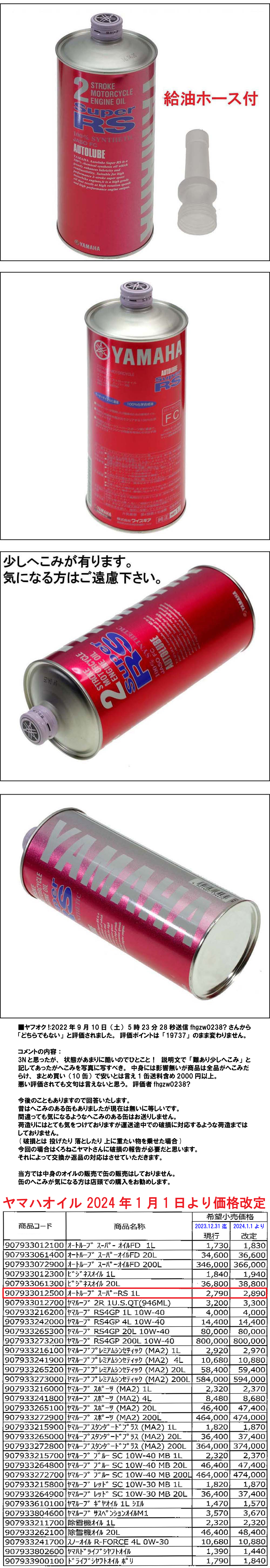 ■ヤマハ純正 2サイクルオイル オートルーブスーパーRS 1L 15缶 新品 ■難あり、少しへこみが有ります。気になる方はご遠慮下さい。 ■2輪車メーカーが開発した2輪車のための専用オイル。 ■潤滑性と燃焼室を高次元でクリアする科学合成オイル。 高性能スーパースポーツバイクから スクーターまで、あらゆる走行タイプに。 ■ロードスポーツ TDR250/TZR250/TZR250SP/TZR250R/TZR250RSP/TZR250RS/ R1-Z/RZ250R/SDR/TZR125/RZ125/TDR80/YSR80/TDR50/ TZR50/TZR50R/TZM50R/TZM50/YSR50/RZ50/他 ■トレール DT230ランツァ/DT200R/DT200WR/ DT125R/TY250ZS/他 ■スクーター トレーシー/グランドアクシス100/アクシス/ジョグ/ジョグ ポシェ/ チャンプ/ビーウィズ/エクセル/ミント/ビーノ/アプリオ/アクティブ/他 ■混合用の場合 20:1 でご使用ください。 ■メーカー価格 1L \2,270円税別 ヤマハメンテナンスページ ■No1711 メンテナンスコーナーにもどる UASのホームページにもどる |