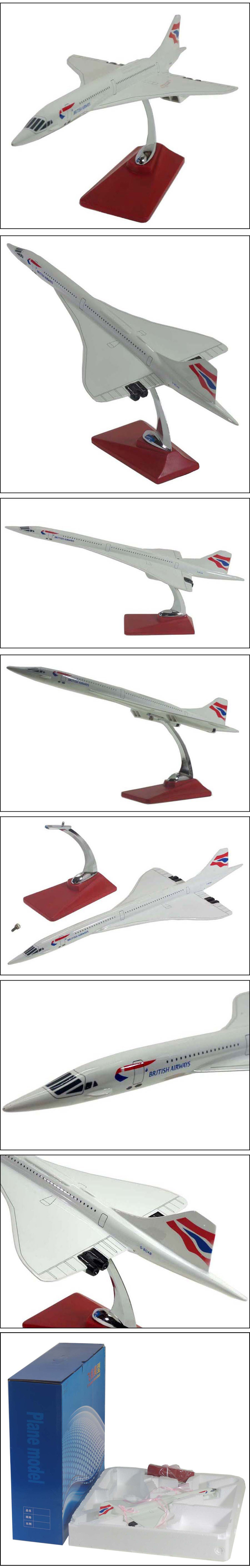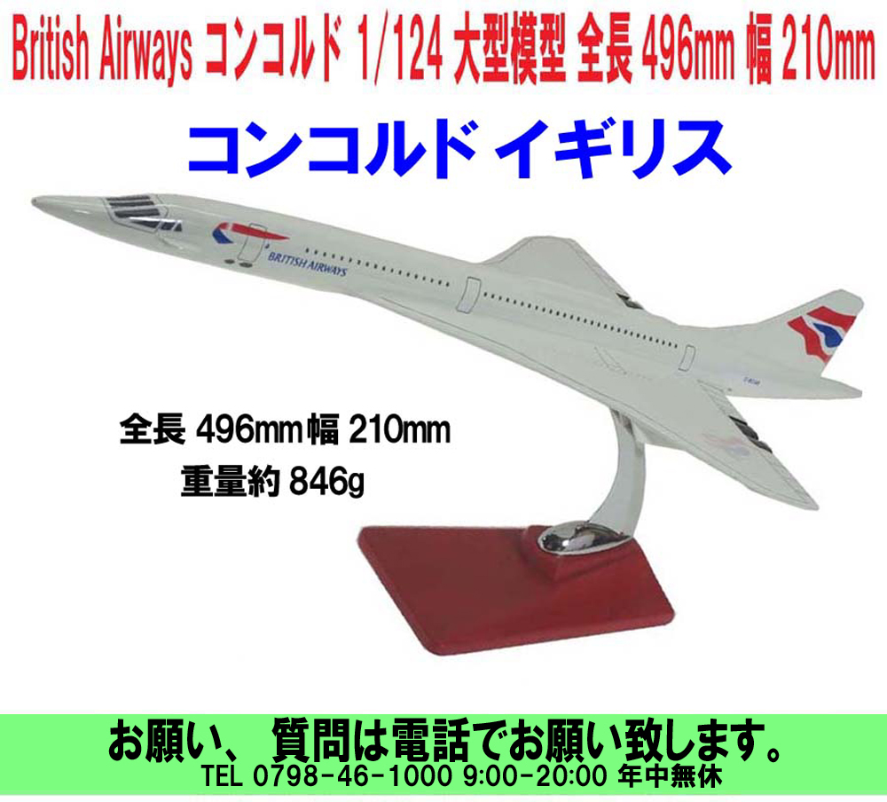 ■British Airways コンコルド 1/124 大型模型飛行機 全長496mm 幅210mm 合成樹脂 スタンド付 ■ブリティッシュ・エアウェイズ (イギリス) ■AIR FRANCE コンコルドの材質は合成樹脂で、きれいな塗装仕上げです。 ■この模型に使用されている合成樹脂は硬くて重量感があります。 ■硬いと言っても、ぶつけると欠けたりしますのでぶつけないようにして下さい。 ■全長496cm 幅210cmもありますので 展示しても、ど迫力があります。 ■箱も入れての総重量は約1.424gです。コンコルドの重量は約846gです。 ■中国製の為完璧な物は有りませんので気になる方のご購入はご遠慮下さい。 ■目立たない傷など有りますので、気になる方はご遠慮下さい。 ■輸入品の為、箱は少し傷んでおりますので気になる方はご遠慮下さい。 ■出荷時、当方で点検の上、出荷させて頂きますのでご安心下さい。 ■特殊な商品ですので分かる方のみご購入をお願い致します。 ■保障はありません。届いた時点で確認お願い致します。不良の場合交換致します。 ■重量約846g 木製スタンド含む ■保障はありません。届いた時点で確認お願い致します。不良の場合交換致します。 名称「コンコルド」という名称は、フランス語の「concorde」と英語の「concord」、 両単語とも「協調」や「調和」を意味し、ローマ神話のコンコルディアに由来している。 しかしフランス側の強い希望により、フランス語式の「concorde」表記が、英語・ フランス語の両言語における共通の正式スペリングとなった。ただし、英語圏での 発音は、フランス語式の「concorde(コンコルド)」よりはむしろ、英語の 「concord(コンコード)」の読みに近い。 最大速度: 2,172 km/h 導入: 1976年1月21日 退役: 2003年11月26日 初飛行: 1969年3月2日 巡航速度: 2,124 km/h 製造: EADS、 ブリティッシュ・エアクラフト・コーポレーション、 シュド・アビアシオン、 アエロスパシアル 以下 ウィキペディア フリー百科事典の引用です 用途:旅客機 分類:超音速民間旅客機 製造者:アエロスパシアル、BAC 運用者** ブリティッシュ・エアウェイズ エールフランス 初飛行:1969年3月2日 生産数:16機 運用開始:1976年1月21日 退役:2003年11月26日 運用状況:退役 仕様 ロンドン・ヒースロー空港内に展示保管されているブリティッシュ・エアウェイズのコンコルド 客室内部寸法[編集]全長:61.66 m 全幅:25.55 m 高さ:12.19 m 機体幅:2.88 m 主翼面積:358.2 u エンジン[編集]ロールス・ロイス・スネクマ オリンパス593 Mk610 アフターバーナー付 きターボジェット4基 重量[編集]最大離陸重量:186,070 kg 最大着陸重量:111,130 kg 飛行性能[編集]巡航速度:マッハ 2.04(約2,160km/h) 最大航続距離:7,229 km 離陸速度:400 km/h 着陸速度:296 km/h 客室[編集]座席数:100席 スーパーソニッククラス(予約クラスコード − R) この予約クラスはコンコルドの運航が停止された後、しばらくどの航空会社でも前面に押し 出して利用することはなかったが、シンガポール航空がエアバスA380を導入した際に新 規導入したクラス「シンガポール航空スイート」の予約クラスとして利用している。 なお同機種は当然に超音速飛行は不可能である。 日本へ来たのは以下の5回で、デモフライトと、エールフランスの運航によるものである。 1972/6/12-6/15 羽田空港へデモフライト(登録記号:G-BSST) 1986/5/4-5/7 羽田空港 東京サミット エールフランスによるフランス大統領特別機とし て2機が来訪(登録記号:F-BVFAとF-BVFB) 1989/2/23-2/25 羽田空港 エールフランスによる昭和天皇の大喪の礼へのフランス大統領 特別機(登録記号:F-BVFC) 1990/9/2-9/3 長崎空港 エールフランスによるチャーター便(登録記号:F-BVFF) 1994/9/5 関西国際空港 エールフランスによるチャーター便(登録記号:F-BVFC) で開港記念によるメモリアルフライトである。関西空港展望ホールにはコンコルドの 名を冠したレストランがある[3]。 ■メーカー希望販売価格 \45,000円+税 ■170528-R150CONB |